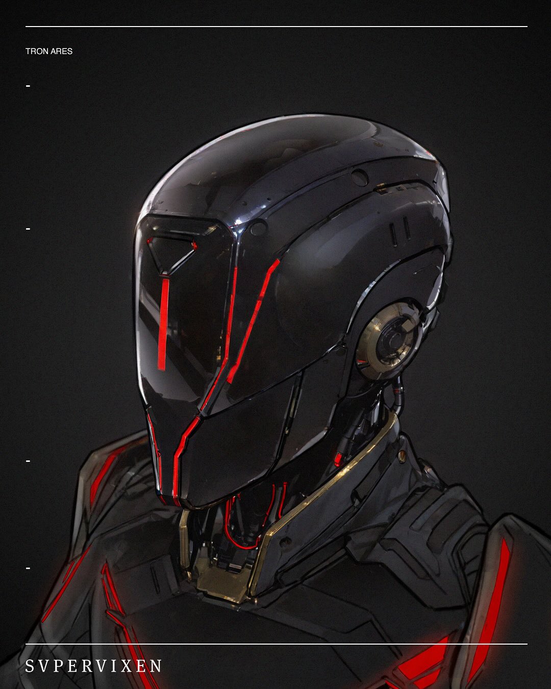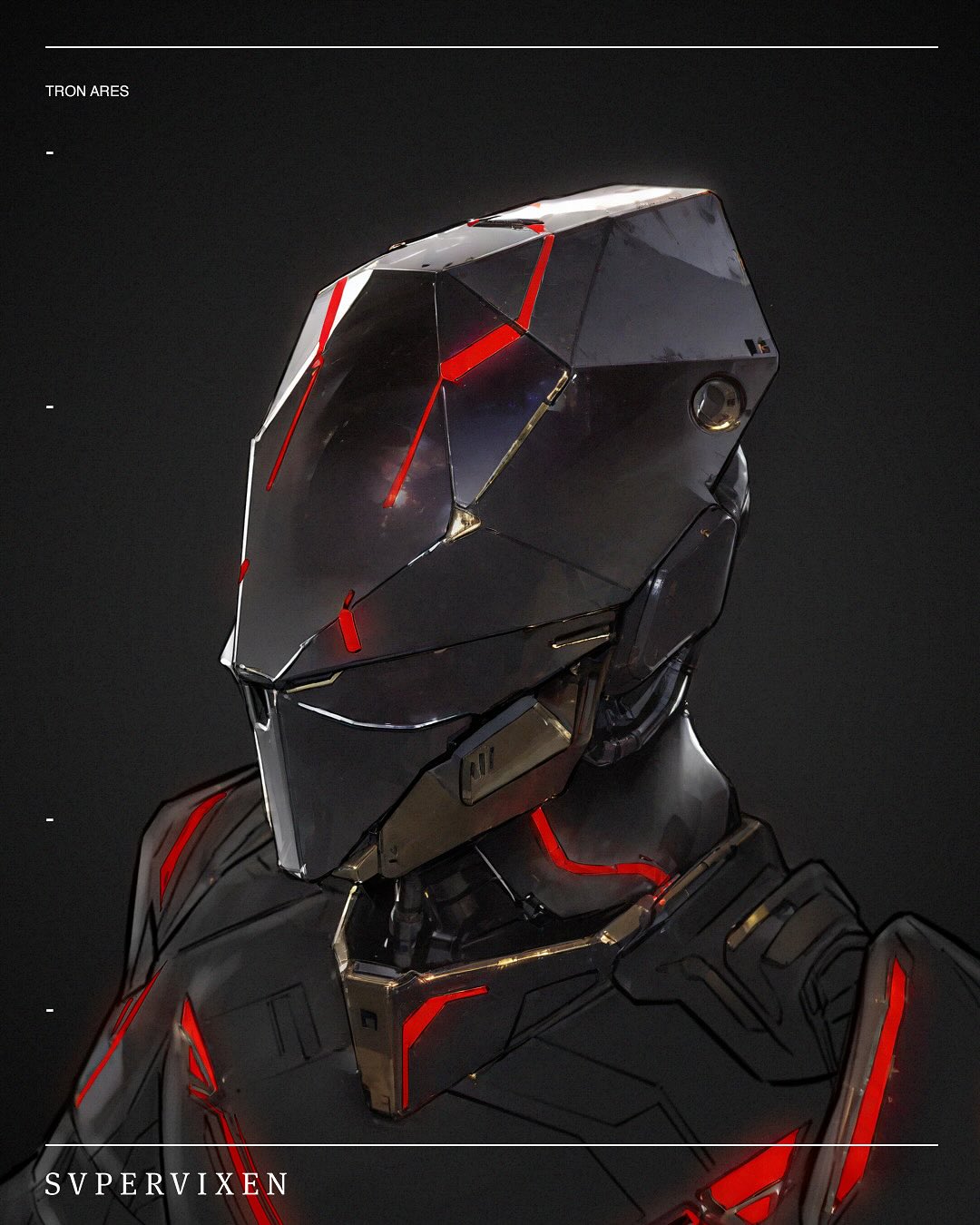 This helmet concept for the Dillinger Soldiers perfectly captures the cold, militarized aesthetic of the Tron universe. The sleek black armor, aggressive geometry, and glowing red light lines feel like pure digital authorityβ€”built for control, speed, and dominance inside the Grid.