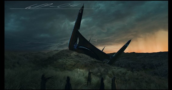 Broken skies, harsh terrain, and monumental scale give this design a sense of quiet menace and forgotten power.